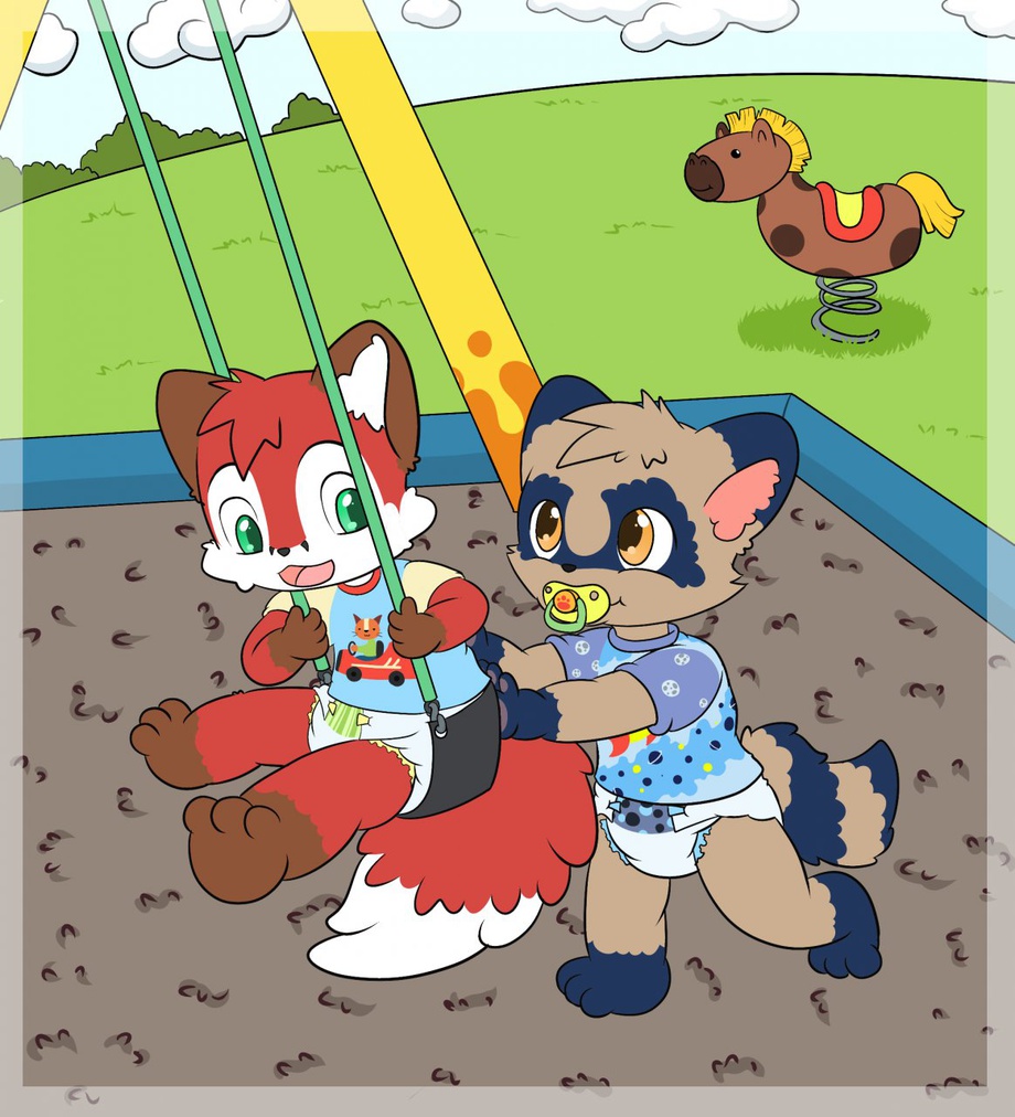 Foxy and Ronaldo was on the way to the sandbox on the playground next to there house. When they come closer Foxy discover something more fun then the sand. It was the Swing that he have notes. Foxy love to swing but he had not learned how to get speed on the swing. So he look on his friends Ronald whit a sad face and ask him if he could help me. Ronald responds whit a baby talk behind his pacifier. But Foxy understand what Ronald was saying. And then every thing when well and they had a fun time whit the swing.
