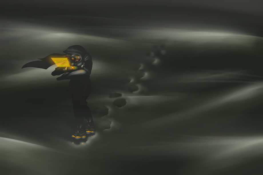 Attempting to find her way through the snowstorm via radar, the last means of finding her way she has, she relies not on her eyes to look around her but her screen. Trudging through the night and attempting to sleep during the day, she hopes to avoid snow blindness this way and eventually find her colleagues aboard the ship."