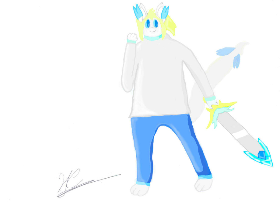 his coat is white and his hair is yellow but has a tail and ears species antennae ears detect the vital energy of all life and the tail detect aura all around