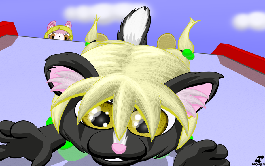 The theme was "Outdoors," and Wish wanted to be drawn either going down a slide or failing to hang from monkey bars. Well, I liked the slide idea better, especially once I got the idea of Wish going down headfirst. Extreme perspective! I constructed the slide in 3D software, but you're not seeing the 3D model here; I only used the software to move it around and decide on a good camera angle, then used the lines and colored it in myself.