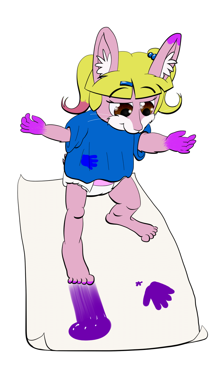 Jennie's tried fingerpainting before, but what about toe-painting? So she's decided to stand up and start smearing the fingerpaint with her toes. I wonder how it'll turn out? She's already got paint on her -- will she get more painted? Will she end up a purple bunny? Will she leave purple footprints all over the daycare with those big bunny feet? Who knows?