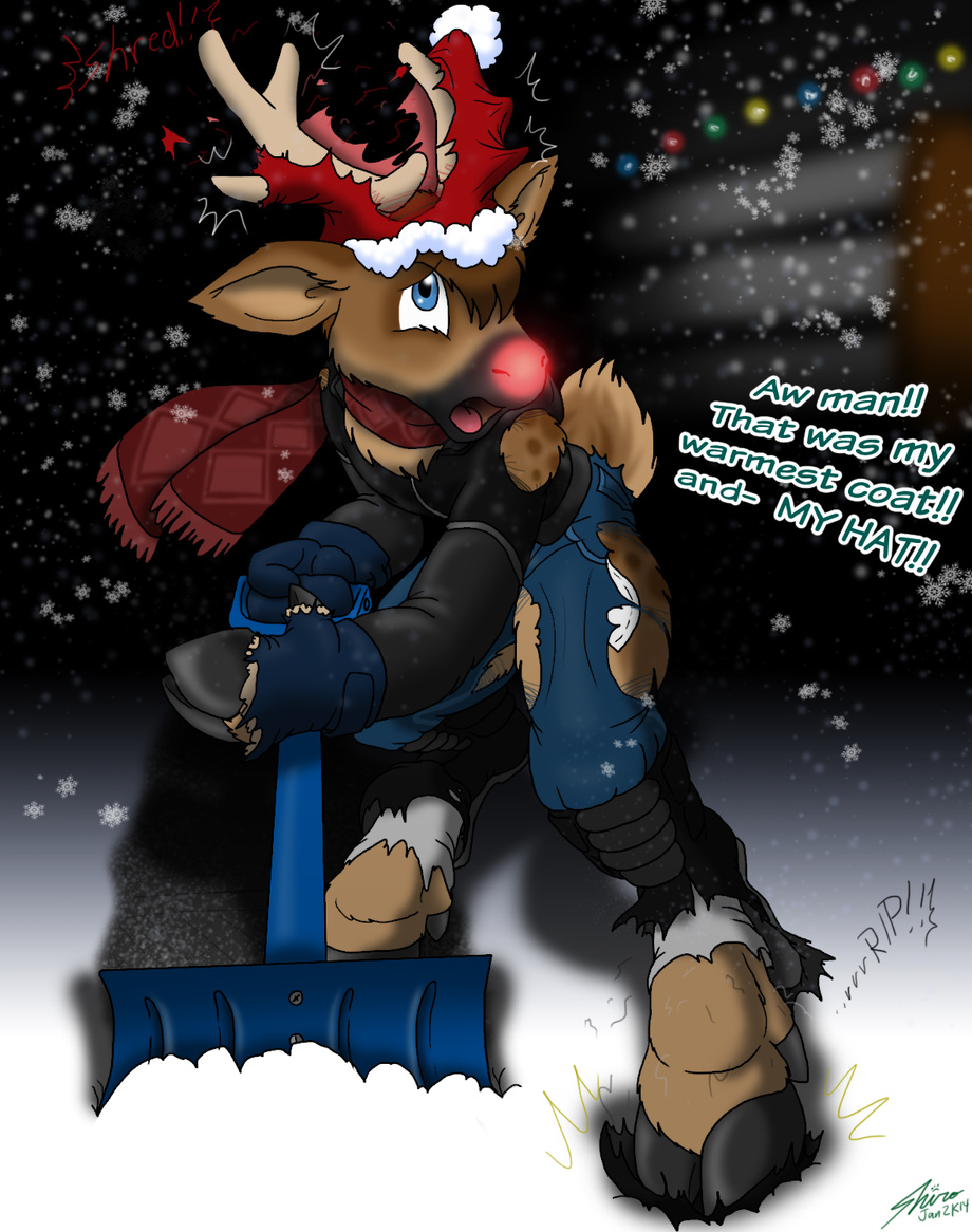 It's Christmas Eve and the weather forecast indicates a major snowstorm, but I go outside anyway to shovel the walk. Within a few minutes, however, I can barely see where I'm going. Luckily, my body compensates for this and I transform into a familiar reindeer with a red nose!