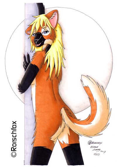 Dorien, a cute maned wolf fem, playfully leaning against a pole. She's naked, but modest.
