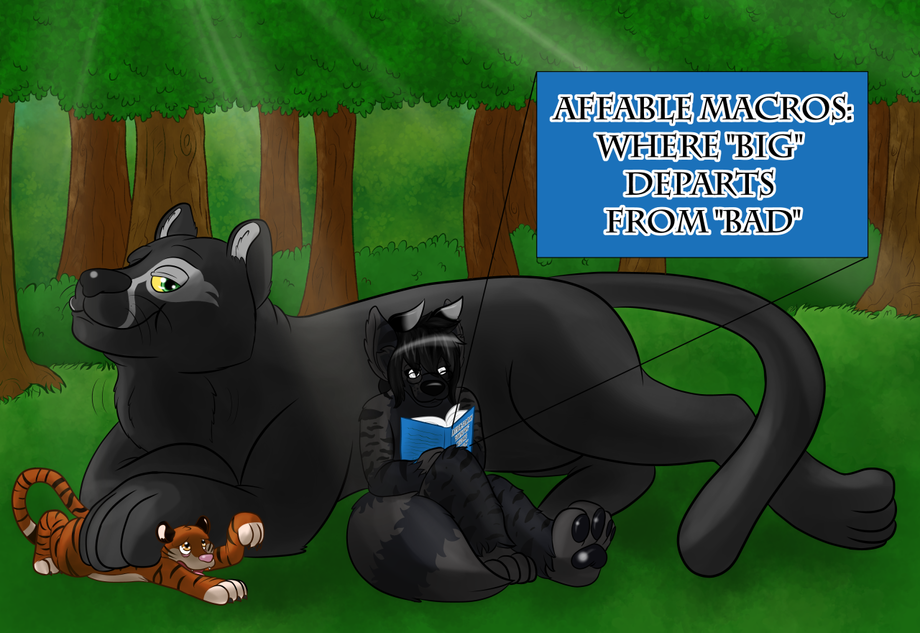 Trust me, if you’re oblivious to why there’s so much dramatic irony in this piece, you’re just blind – or perhaps you’re naïve enough to believe that Anima is just playing with a tiger underpaw and is gorging on some sort of wild macro lettuce. Either way, it’s rare to get a chance to lie behind the first (and I do believe only) couchpanther on FA. The dude literally wrote the wikia on vore, so it’s definitely an honor to be on the OUTSIDE of him chillaxin’ ‘round the foliage. However, I keep telling him that tigers are rare morsels and should be eaten sparingly – so you know what he does? He bloody paints a mountain lion with the same markings just to get a rise out of me. Too bad for him that I’m far too immersed in this novel to give much of a damn, if any at all!