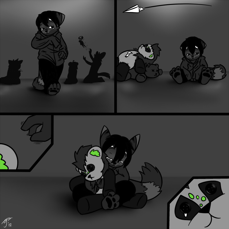 ~ A secluded, almost neglected nursery in the heart of suburbia vignetted by the silhouettes of infants and toddlers busy articulating the joints on their action figures or manipulating dolls with all the dexterity of a novice puppeteer. Amid the controlled chaos lie a pile of disheveled stuffed animals that even the youngest children find too behind and, upon its periphery, lie a maned panda with neon green trim - slumped over, so thoroughly ostracized that it's even forbidden from residing with the old and dilapidated. Truly, a model pariah. Ambling over comes a child hewn in monochrome, drying his face with a sleeve lopped over his hand as he had just begun to recover from being cast out by a popular clique in the day care. Flouncing into a corner beside the pile of plushies, he folded his arms - struggling to convince himself that he need not for such 'meanies'. 'Twas a full ten minutes before he dare move from his dower pose to see the bear beside him - poised in such a fashion that mirrored his own sullen mood. For quite some time, he just stared in its general direction, feigning disinterest afore inching his fingers closer. Then, in a single fluid motion, the panda was scooped from her seat and into blithe, quivering arms. It was a small comfort, but it was just enough to spread a smile across that nubile visage. It was just enough to make a certain doll, previously denied privilege to any and all affection, feel...useful again. |