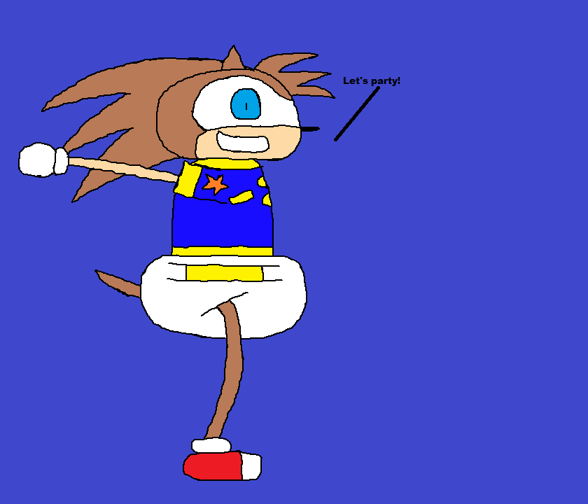 White Diaper with Yellow Straps, Blue, Yellow, and Orange Shirt, White Gloves, Red and White Shoes.