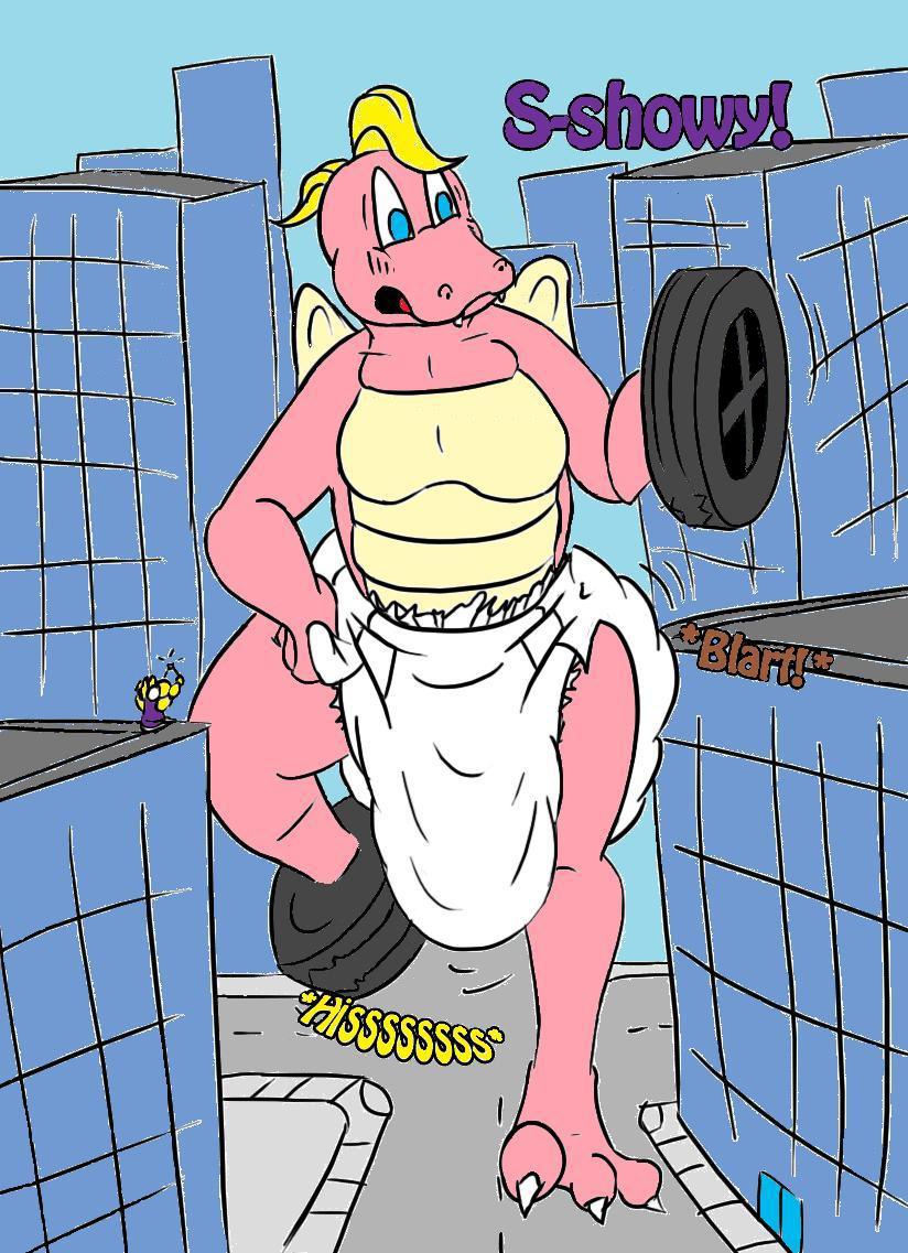 One day Cassie went to Dragonland to a wishing well, wishing for a large car with lots of storage space for her friend, Showtime. Unfortunately, the occupant of the well was quite the prankster, eventually causing the dragon to grow rather huge, get thickly diapered with incontinence, and also turning her into a vehicle. Such effects were only temporary, but still were enough to humor a certain dino on a rooftop, watching while Cassie being unaware of his presence.