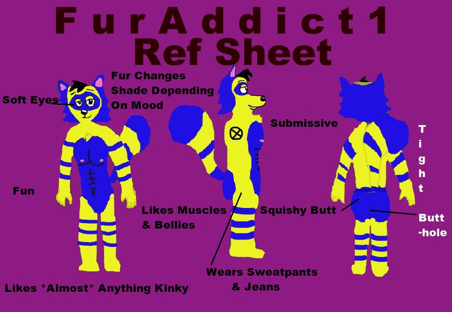 blue "mask" over eyes, brown eyes, tight but squishy anus, 3 blue stripes down arms, black hair on top of head, blue ears and outer fur around head, blue middle, yellow arms, yellow tail w/ blue stripes
