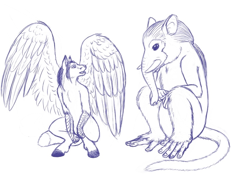 Two of my friends gave me ideas of what animal combinations they would like to see themselves rendered as. Well, one of them did, the other threw out the most ridiculous combo he could think of thinking I couldn't possibly make it work. WELL HE WAS WRONG. Thus were the Pegafox and Elemonkster (that's elephant-monkey-hamster) born.