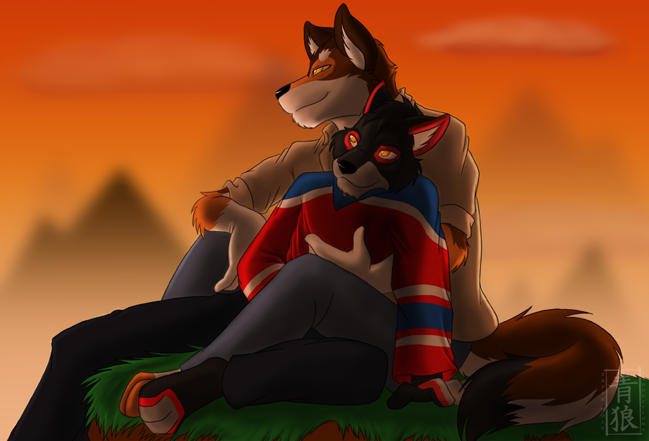 of him and his mate cuddling in the twilight hours watching the sun set.