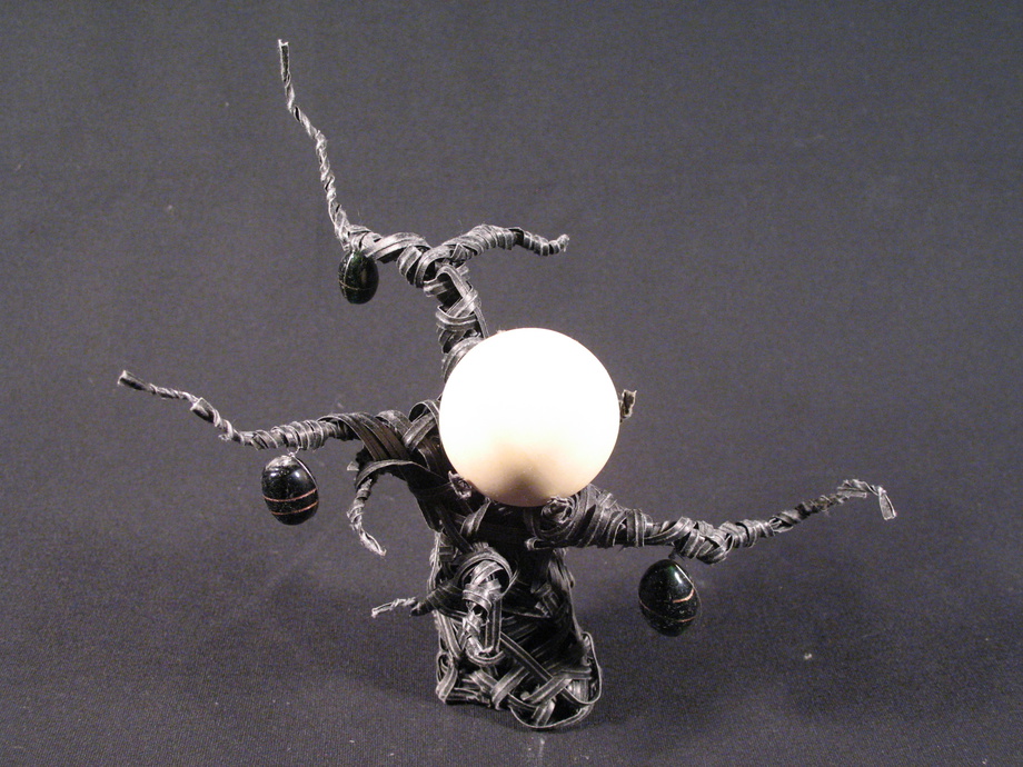 Made from twist ties, beads, and a rubber ball.