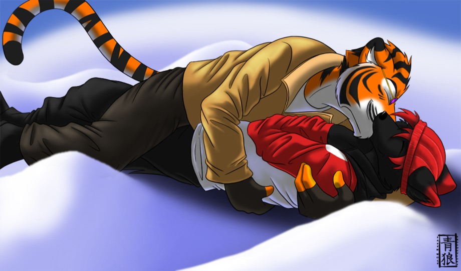He and his tiger steal a kiss in the snow.