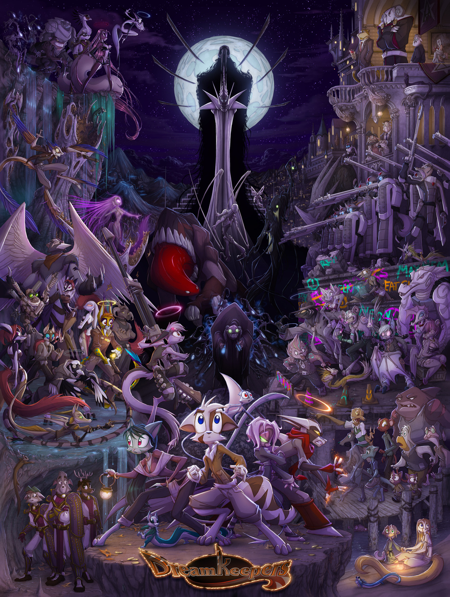 Our new full-size Dreamkeepers poster, featuring virtually the entire cast of the graphic novel series to date. This was a doozy to draw- check out the progress videos here: