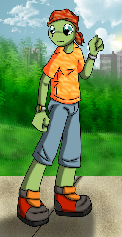 Andrew walked the park path humming a tune to himself. It was a warm day out and the turtle was happy to enjoy it. He was particularly glad this stretch of park was empty as he walked. He liked how the part felt when there weren't as many people in it. He liked the quite. Andrew sighed a bit wishing he was more like his ancestor. Like any kid he'd read all about the Five Patriarchs. The Four brothers and their father. The Patriarchs freed several hundred turtles from a FOOT Clan lab that wanted to use them as troops. But the Patriarchs put a stop to that. Freed them. Lead them. Today the Patriarchs' blood lines survive save for Master Spinter's though his ideology lives on. Andrew was descended from Raphael. The stoney warrior with a fire in his heart as it's often said today. Andrew couldn't have been more different from his ancestor. He was generally quite, smart, not one to want to find a fight. He kind of let people walk all over him. He wasn't the strongest either and well the Patriarchs certainly never needed a diaper at his age. Andrew was sickly when he was little and this seemed to be a lingering effect of that. Andrew wished he had the courage to speak up more for himself and the strength to fight the bullies that pushed him around and made fun of him. But just as he thought that he heard a familair voice from behind and turned starting to wave as a human friend came running down the path. Least he had a few friends. The two continued to walk through the park and talk about anything that happened to cross their minds and Andrew's thoughts about his "weaknesses" faded from his mind for now as his friend offered a sleep over. Andrew grinned and accepted calling up his mom to ask if it was alright. She said yes and told him to have fun glad that he seemed more cheerful than when he left. With that the two friends high fived and headed for the edge of the park. Their minds already spinning on the fun that was ahead.