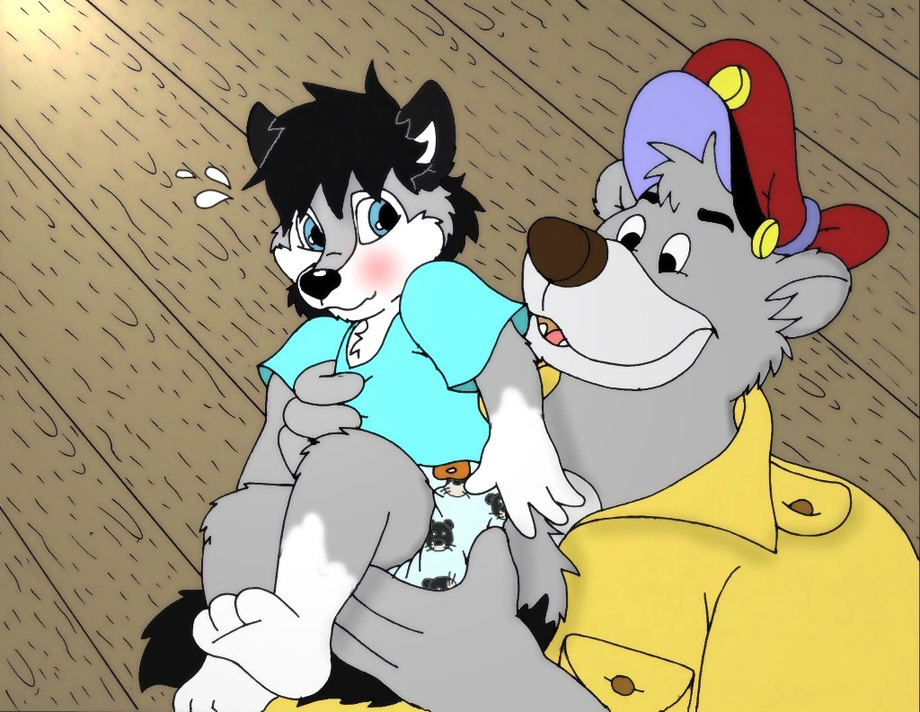 Baloo is again failing behind in paying his debts and he decided to took some babysitting jobs. And there is a wolf always in beed of such babysitting. So here they are, and the bear is calling the little wolf such a cute little britches he is blushing a lot. But the bear plans to get him into a bath, and that is not going to work out as Baloo plans. Loupy isn't the kind to do baths. And he just so love his Bagheera-themed diapers ;-)