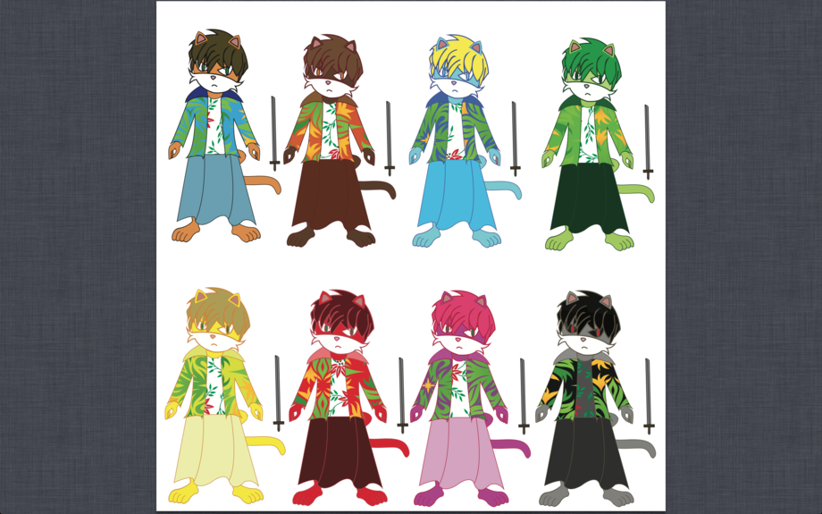 my proffesor said that we need to give the character different colours then choose one to put it in the habitat he'll be in, i already have in mind hat he's going to be in, but i'm not telling, its a surprise ^^, anyways tell anything you like about his multiple colors ^^, enjoy.