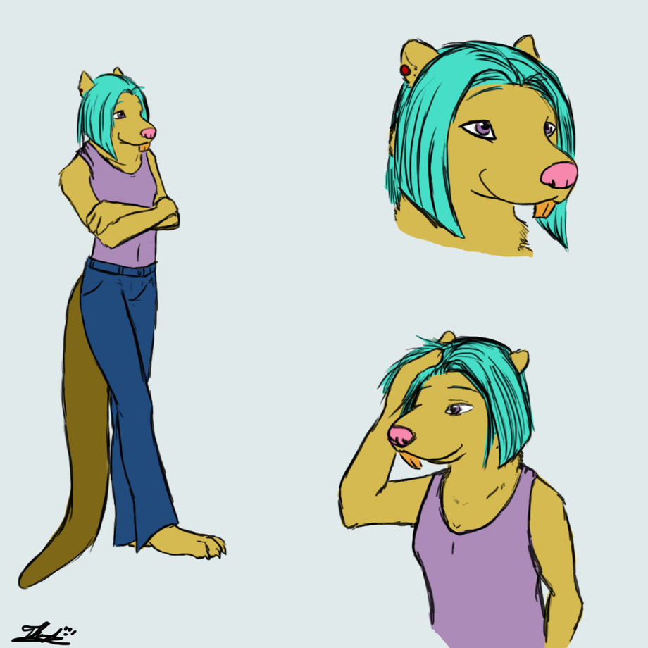 Very thin build. Her fur is a golden color, her tail a light brown, and her nose is pink; very different from most beavers. Her hair is a blue-green mix that she keeps at about shoulder-length. She has red stud earrings that she wears, one in each ear. Her eyes are a pale violet color.