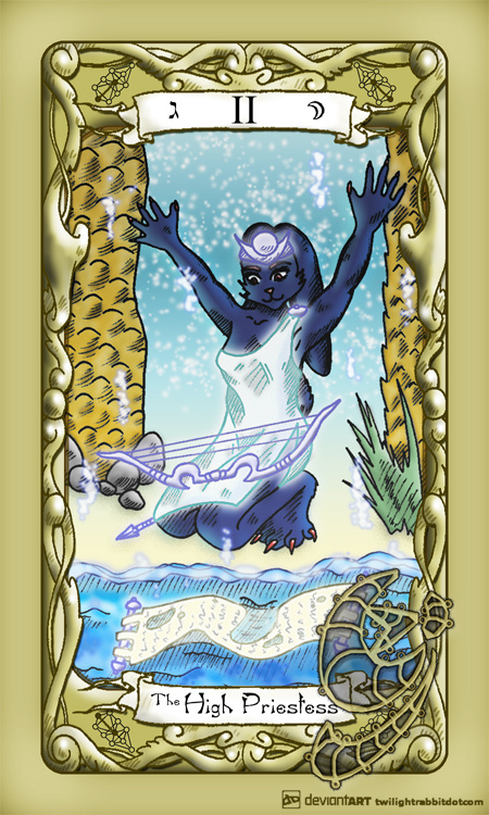 Name: The Magician Numeral: I Planetary Trump of: Mercury Hebrew Letter: Beth (house) Tree of Life: The performer on the path between Kether and Binah. Concept: The body is a temple providing shelter from the world of illusion. Description: An older white rabbit wears a blue and red top hat, blue robes trimmed in gold, a belt made of serpent. He juggles a wand, flying egg, basket and carrot. A feather quill and scroll are tucked into his belt. Silver stars spiral in the background. Character: He dons the top hat from the Trickster, it's not too big for him to wear now but fits rather well. The serpent about his waste worn as a belt isn't a skin but is alive and symbolises infinity, completion and masculinity. The colour of his fur has faded, but his robes are ablaze with colour, he is easily recognised as someone confident and capable. He's the juggler going about his trade. The four objects he juggles each refer to one of the four suits in the Twilight Rabbit Tarot (more on this subject can be found in the chapters pertaining to the Minor Arcana and the Court Cards). The wand represents the suit of Clover and activity, the basket the suit of Passions and emotion, the carrot the suit of Carrots and trouble, the egg the suit of Stone and value. The egg is the Cosmic Egg and it connects the concepts of a macroverse (deity) and a microverse (us). The Universe still unfurls about him as it did in the Trickster, but the sky is twilight and the stars have dimmed, losing their sparkle and lustre in comparison to his glory. Everything is up in the air but under his control, his will rules over all. The wizened Trickster has become a master of the aspects of existing in the Universe. All four aspects of life (corresponding to the four suits) can be bent to his will. He is every poet, artist and scribe. He isn't a slave to time but still understands his place amidst infinity. He’s the worker, the lover, the warrior, the master, The Magician. Meaning: In readings this card signifies a person confident and strong because he believes himself fully capable. Often he’s asked to perform in order to prove his prowess. He’s happy to oblige and show off. History: Originally this card's name literally was the Trivial Performer. This is a card of excitement, capacity and showing off. It is the card of will and mind over matter. Whenever the Magician is paired with an Ace, it can be derived that the querant (or an alternate person in discussion) has mastery over that Suit's particular area in life. An example would be the Magician paired with the Ace of Clover would indicate that someone in discussion has mastery over cooperative endeavours, career and/or creative forces.