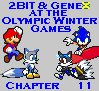 The race began, and the boarders shot out of the starting gates like rockets. 2BIT, Rainbow, and Copter were all proceeding very shakily. The others passed them right away, and somehow Punchy got the early lead. "What!? I'll show that out of date reject!" Spiny growled. He fired several Chaos Spears at Punchy, which didn't knock him over, but did slow him down as he attempted to keep his balance. "Whoa!! I knew that guy was gonna cheat!" Punchy yelled. Meanwhile, 2BIT had been proceeding along the right edge of the track, and managed to pass to the front without anyone's notice. Seeing him ahead, Polar aimed his right arm at 2BIT and fired one of his powerful beams! 2BIT jumped up and hovered in the air with his jetpack in order to land safely, but this cost him precious time, and Polar took the lead. "Sorry, but I won't be losing this race!" he growled. Wings grew angry at the sight of all the cheating. "Someone's gotta teach you a lesson! Eat tongue!" He shot out his long tongue and swung it into Polar, knocking him into a spin! "Tha wath paybath!" said Wings with his tongue still hanging out. As Wings passed to the front of the pack, Jet watched from the rear, chuckling. "I see... That's how you're all gonna play. Well, no amount of cheating's gonna beat me when I REALLY start racing!" he thought. In the back of the pack was Rainbow and Copter, and Copter was in last place. "I don't care how lame I look right now. I'm not gonna crash like I did skiing!" he said. "But at least you won that race!" Rainbow pointed out. "You can do it, Copter!" 2BIT shouted back, "It's like grinding! ...well, not really. But I figure it's close." Copter glanced down the slope and nodded. "Right... Grinding... I'll make like I'm grinding..." He crouched on his board and started to pick up speed, quickly passing Rainbow and 2BIT. The racers were now near a jump ramp, and each racer made the jump in their own way. Wings hovered in midair a moment with his wings to enable a smooth landing, while 2BIT used his jetpack. Copter was too focused on "grinding" and slid off the ramp without jumping! "Yikes!! DON'T CRASH!!!" he shouted, spinning his tails to gain some height and land safely. "Whew..." he sighed.