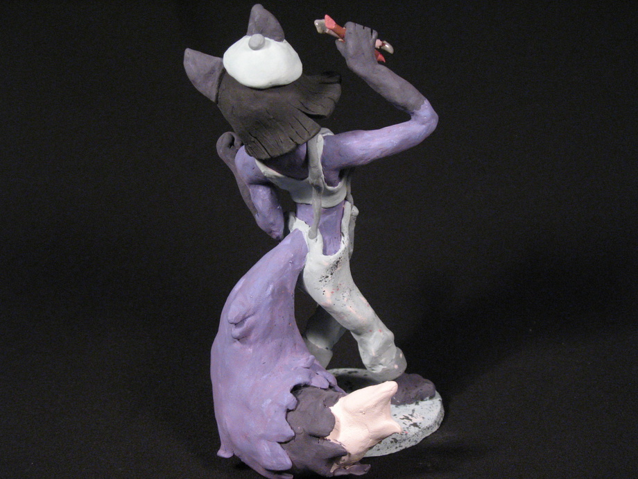 My fursona, Ellen, with my two favorite ceramics tools.