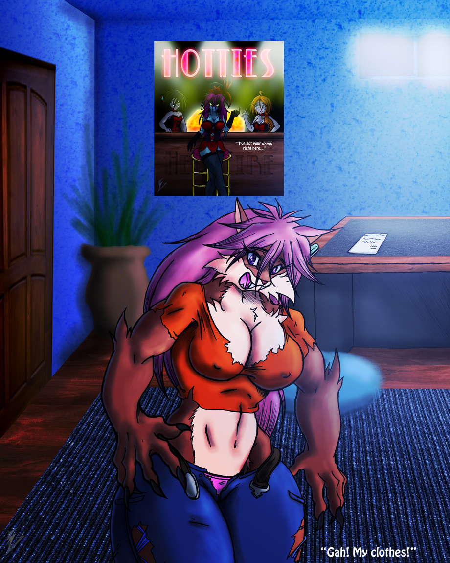 Jodi is in her bedroom. Her face looks in shock holding up one of her hand in shock at sight of claws growing from the changing hand. Her open mouth shows fangs growing too with ears becoming slightly pointed too.