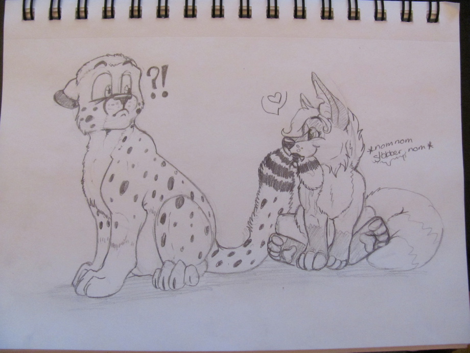 OKay another little gifty for the Eep cat -cheetahjab- My sona omnoming his tail.... I think she may of slobbered a bit much on that tail....
