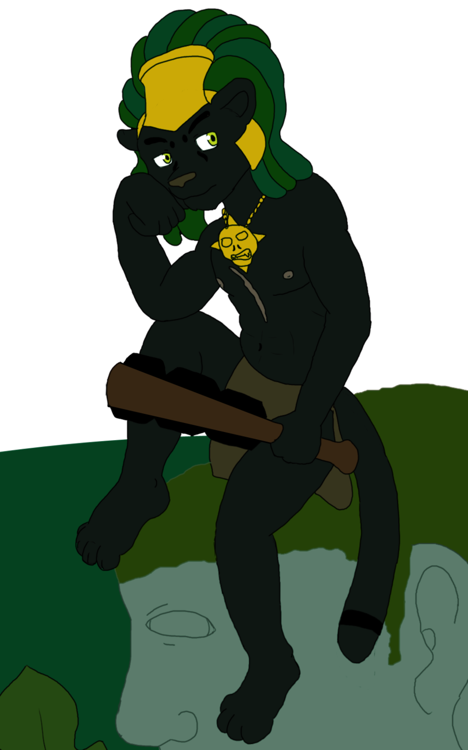 A fierce Panther (Black Jaguar) warrior sits in the dark forest. A scar across his chest, His bright eyes meet yours, he holds his trusty sword in his paw. there is one question you have to ask yourself...