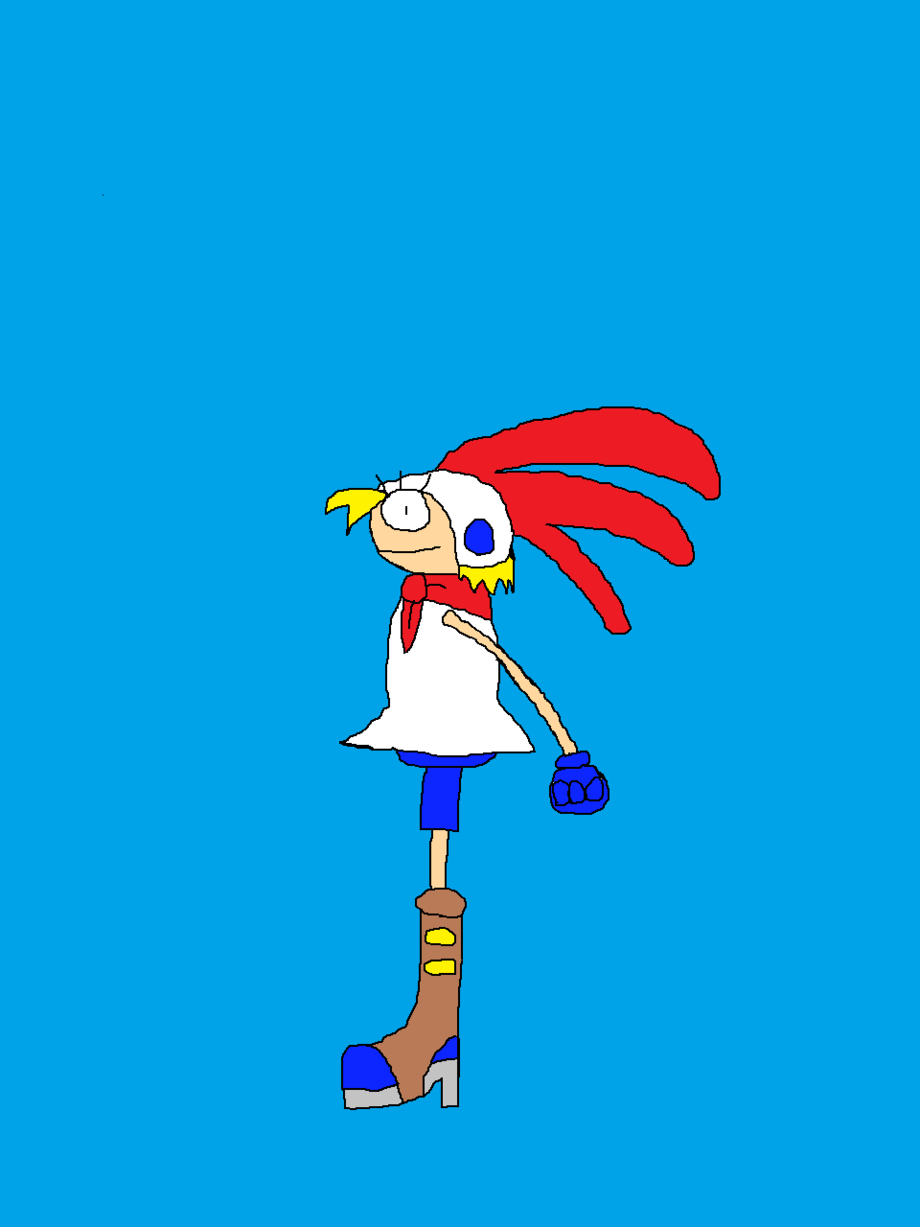 Chicken Suit: Red, White, and Blue Chicken Hat, White Shirt, Blue Shorts, Blue Fingerless Gloves, Brown, Yellow, and Blue Boots.