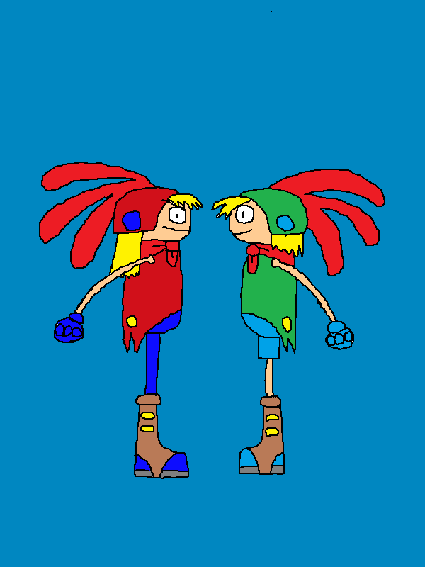 Chris: Red and Blue Chicken Hat, Red Shirt, Blue Pants, Blue Fingerless Gloves, Brown, Yellow, and Blue Boots.