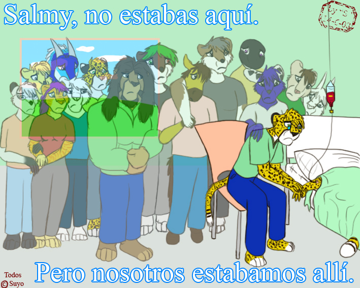 In the second pic is when you see that S-cheetah can be a nice guy too ;) On april-may 2008 my dad had heart surgery. I had to spend almost 2 months paying company to my mom and going to the hospital (which was in a different town than where they live) because they caught him almost 'in the last moment' (public health system is not SUCH a paradise, but if moving the right strings, it works). So the pic just features a lot of spaniard furs and me holding my dad's hand. The text says 'Salmy, you weren't here, but we were there.' Very sweet of him :)