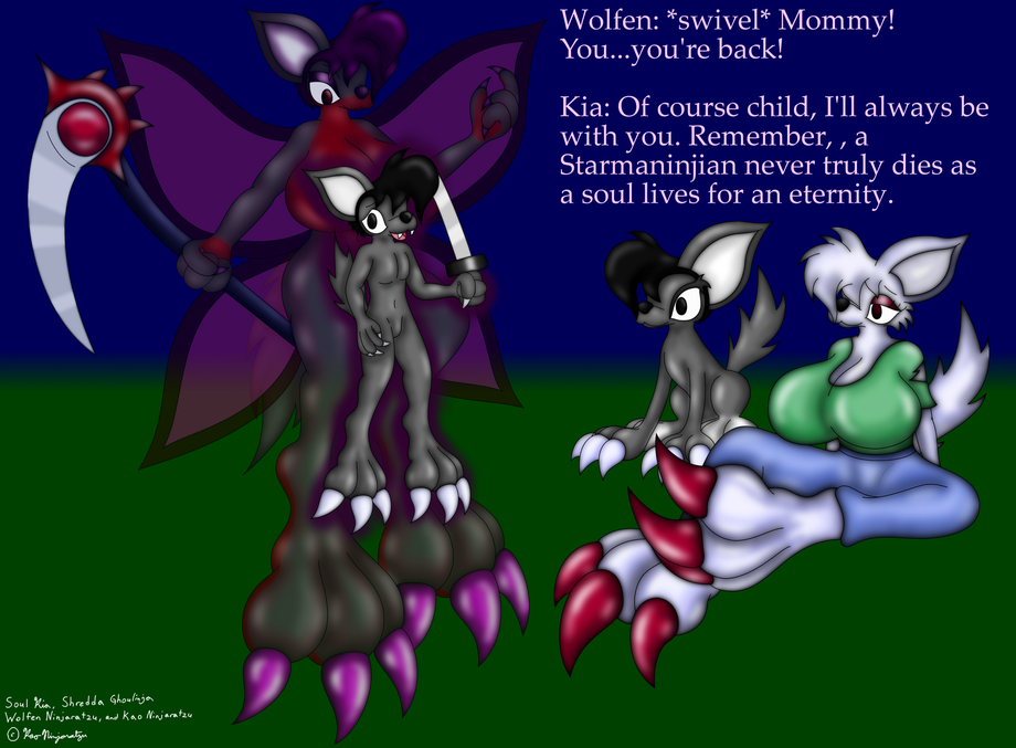 Anyway, Kao Ninjaratzu, Kiara (Kia) Ratzu, Wolfen Ninjaratzu, and Twilight Polaris (the white wolf falsely named "Shredda") are copyright to Kao Ninjaratzu