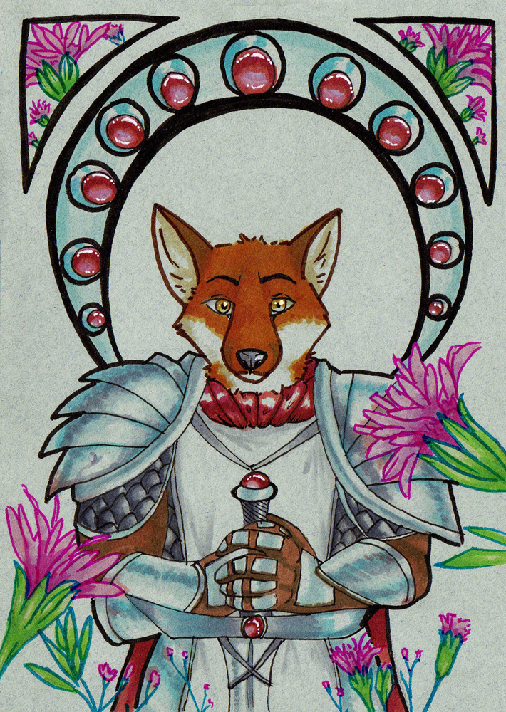 Inspired by how the word "palafox" (a type of flower) conjures images of both the flower, and a paladin fox. I blended all three in an attempt to mimic art nouveau style.