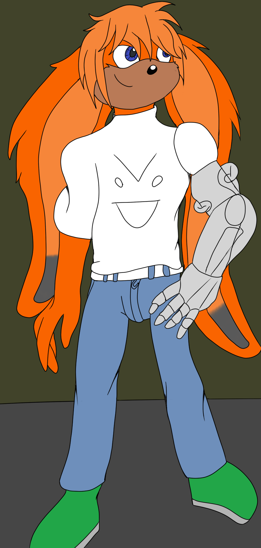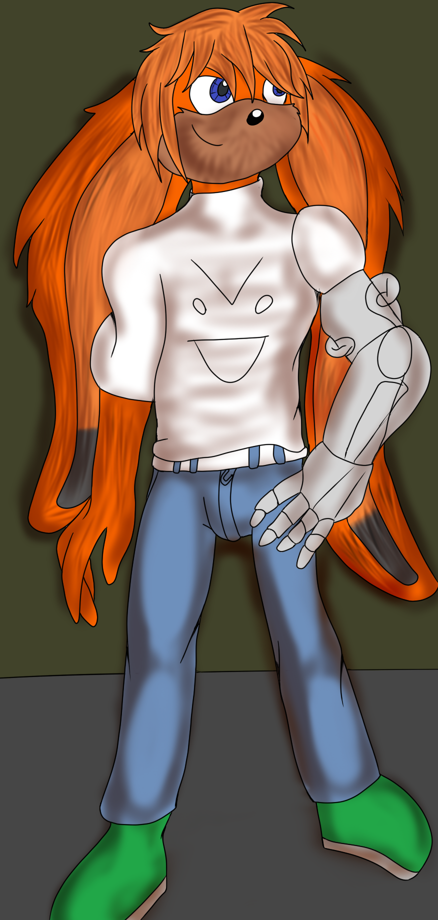 Updated, with his mech-arm... Equip with Pants sneakers and T-shirt drawn by @HeattheDragon colored accidentally by
