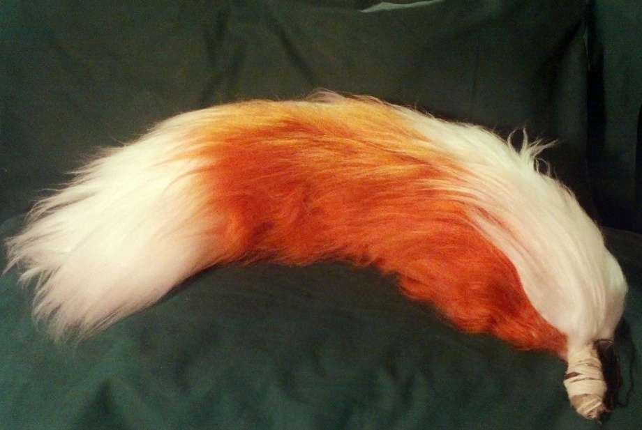 A finished yarn tail for a good friend of mine. It was made with a wire inside so it is poseable, and it's about 20 inches long. It is very bouncy, waggable, and the fluff moves and sways just like on a real tail.