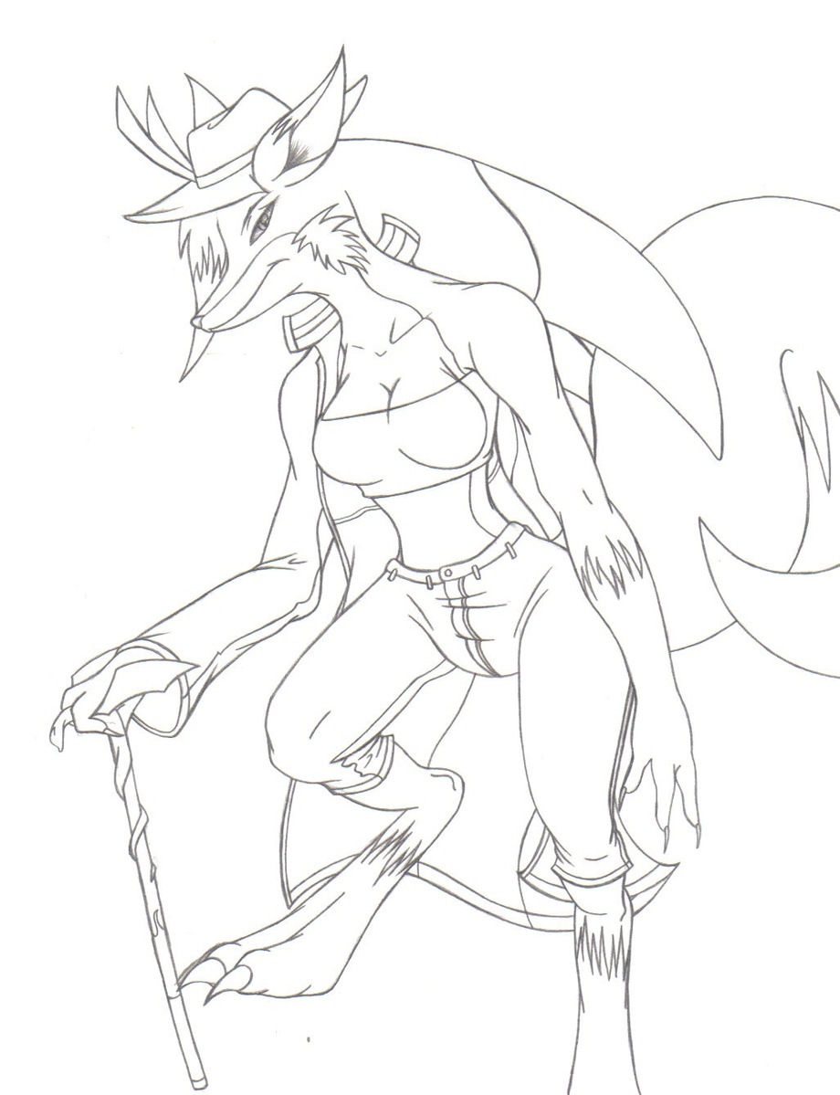 Standing taller than the average male human at just above 7 feet, Jen Foxworth, who prefers to be in female form most of the time. She is used by the main imperial government as an assassin and spy, and also a hunter. In color, she has most of the markings close to that of an Earth species called the red fox. A purple being her most accented coat color, with a white chest, muzzle, tail tip and belly. Ear tips, hand paws and feet are black as well as the tips of her head extensions, plecaria. She wears most often a long black trench coat over a black tube top and pants that halt at her upper heels. She also sports a black fedora with green tweed ribbon in it, and carries a heavy brown cane accented by a dragon head at the top of it for her main weapon and tool.