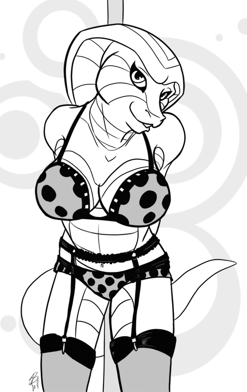 Old Artwork from 2009. Digital ink request done for Marjask of his vol-naga character Ksa. Did I ever love this request. Not only did I get to try an anthro snake, but it was my first "pinup" style request. This took a few tries to get the pose right, but I love the result.