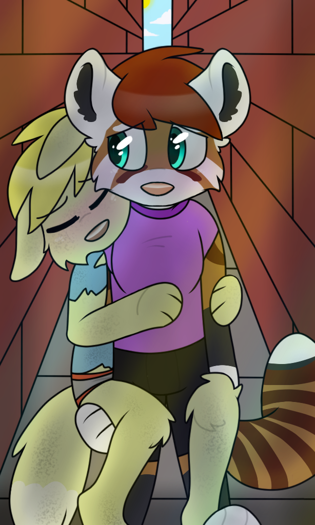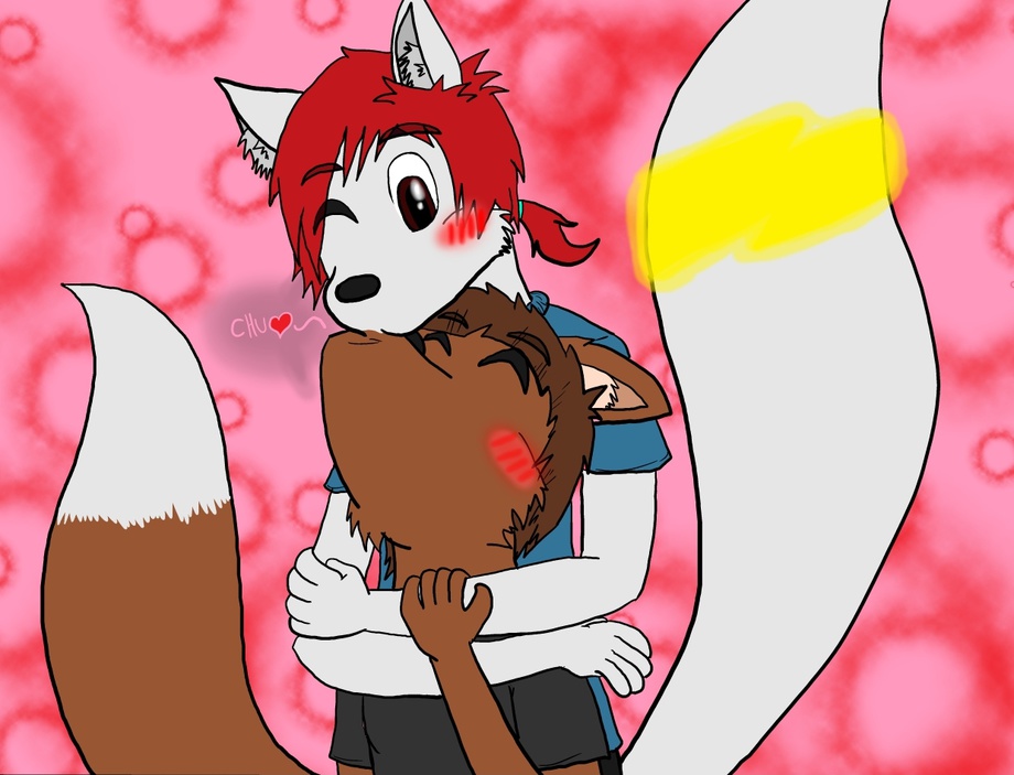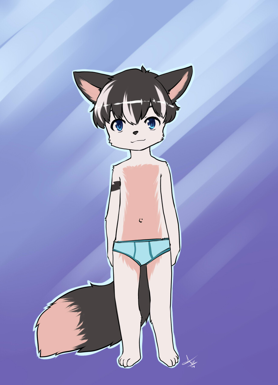 Small and timid looking, has dark gray ears and tail, a tan tail tip, tan belly fur and inner ear fur, he has a zigzag marking on his arm that comes from his mothers side of the family, when around someone he has feeling for the marking glows different colors depending on the person