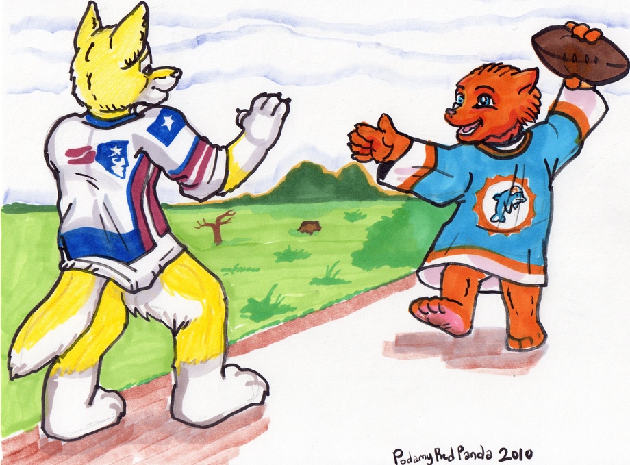 Goldenwolf and his son pass around the football while they both wear their team colors...proving love beats a rivalry any day.