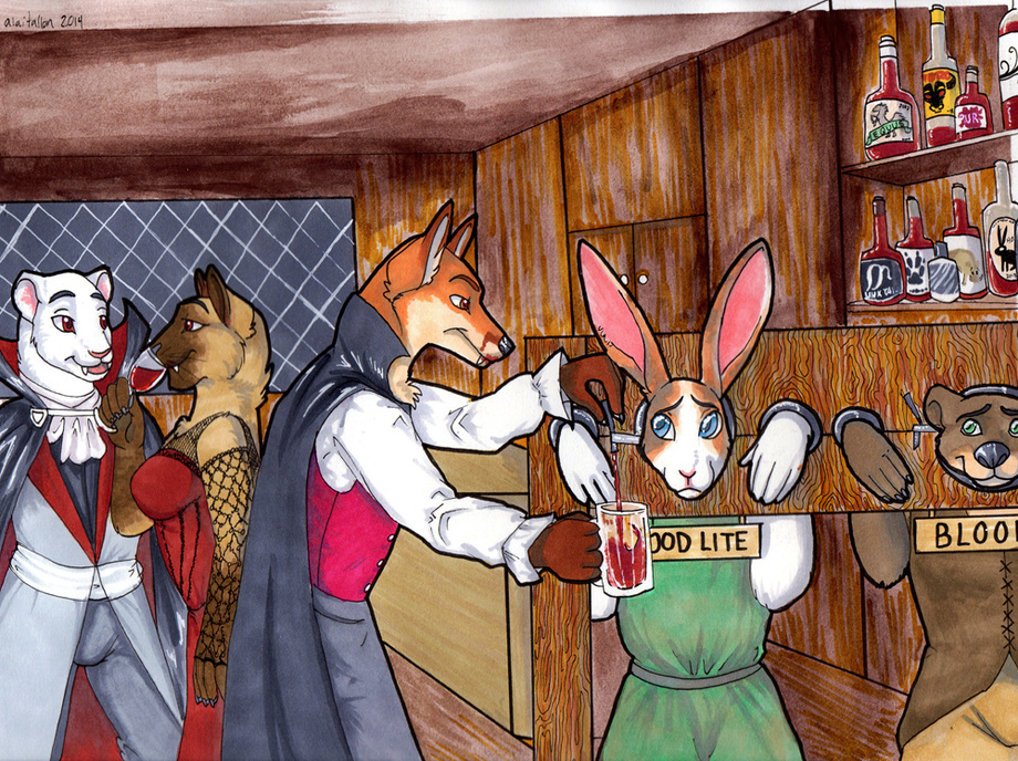 This is a commission I took at FWA 2014 for a scene with vampires having a party, with a few hapless captives serving as living spigots. It took a lot of time, but I had fun with this!