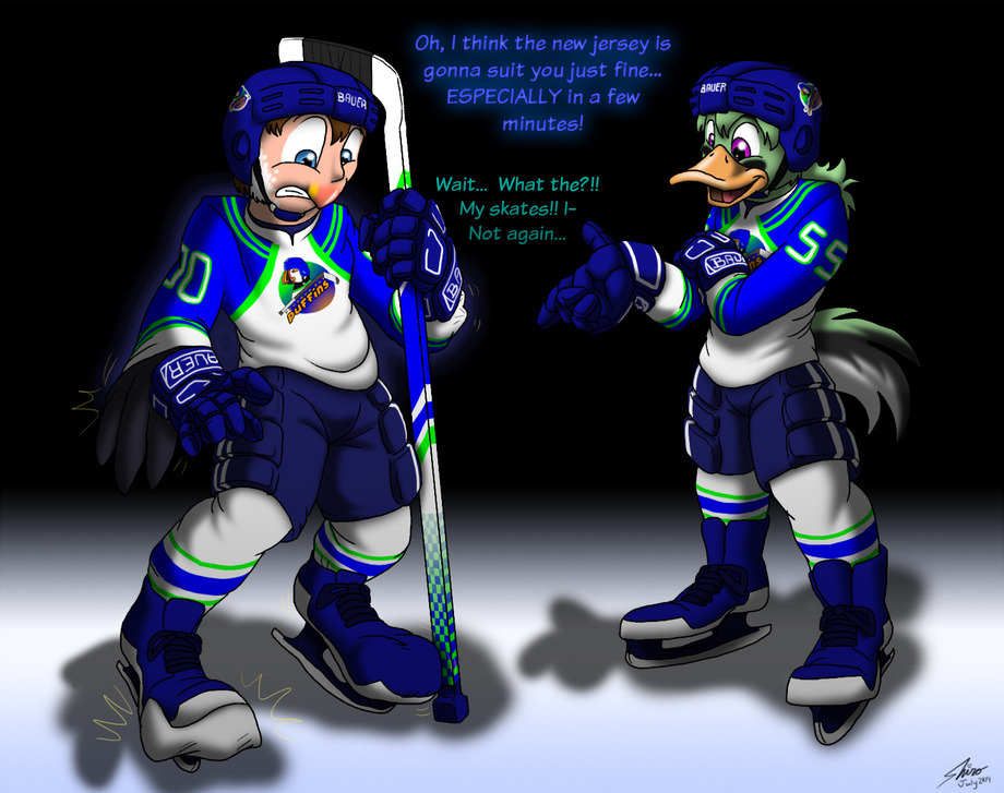 My brand new uniform finally starts to tear as my feet burst through my skates, a tail pops out of my pants, and claws start to poke through my gloves. My helmet strap snaps as my beak grows out and my shorts strain from my expanding legs!
