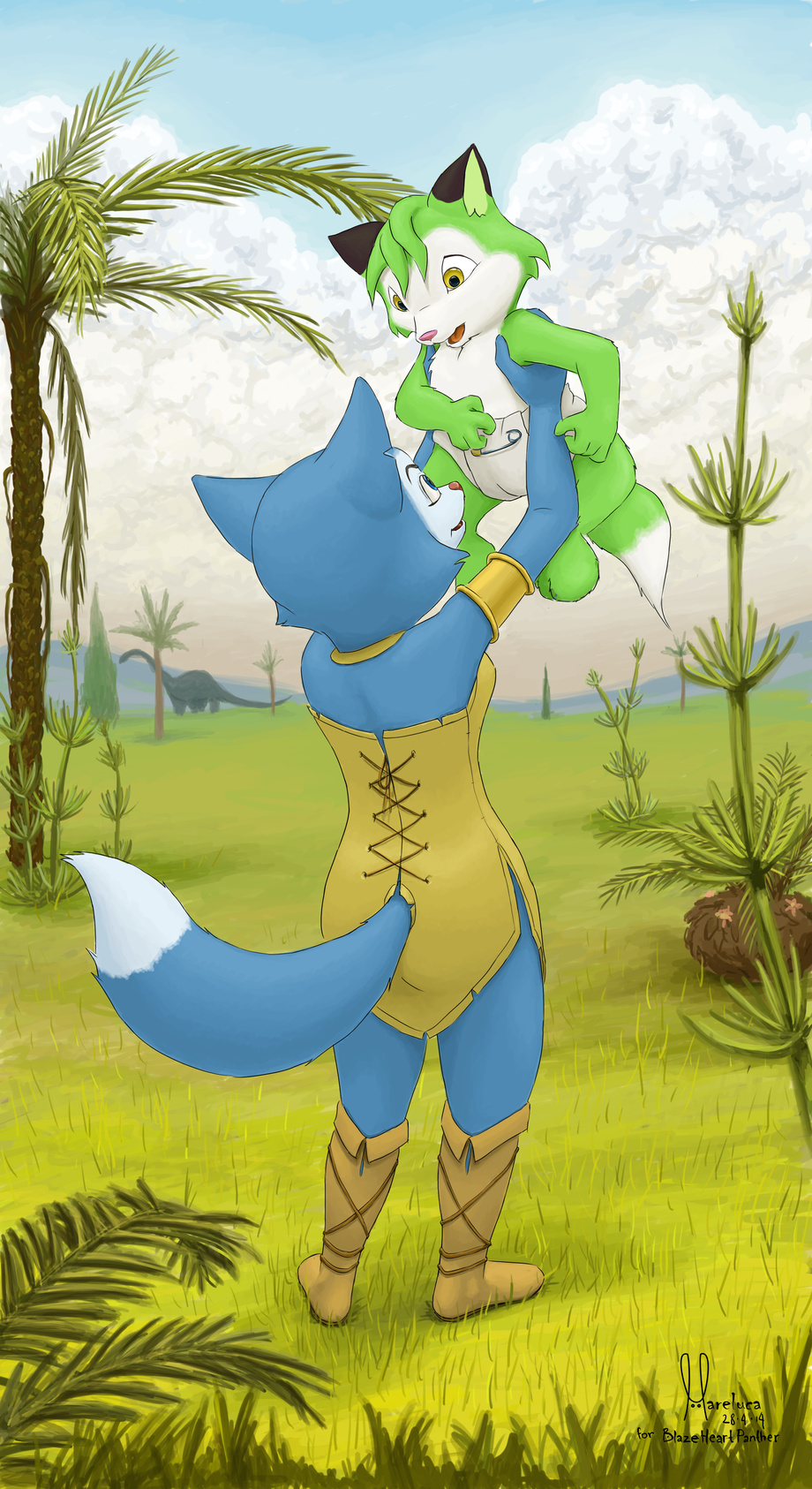 this pic depics (heh, pic depics XD) Krystal with her little baby cub Topal (Me!) out in the wilds of Dinosaur Planet. she raises me up into the air and tells me how special I am to her.