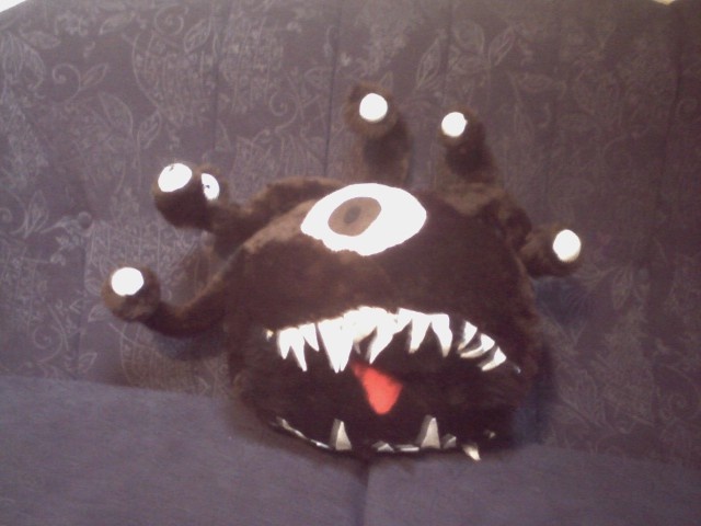 This is my beholder dice bag. I went a little over the top on this one. Its two foot wide/high not including the eye stalks.