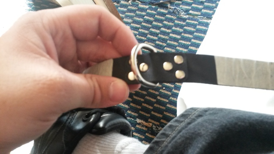 The buckle and D-ring were salvaged from a different handmde collar I bought from the vendor's market... a very badly made handmade collar, only big enough for a small dog, with too-thick and stiff leather.