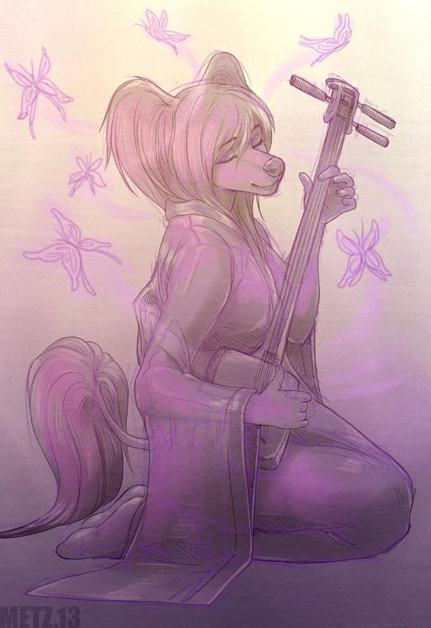 Same old BS I occasionally write. This is just an idea I had for a little while. Sixty is Playing a Shamisen under the Twilight (Moonlight for those who thought about the Book-gone-movie). A small school of Silverlight Butterflies flutter around, glowing and dance to the music.