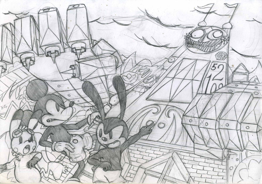 Go figure. When Oswald returned to the Disneyverse, the two half-brothers didn't meet for breakfast at Minnie's. No, they were thrust into a nightmare dimension and a battle for their very lives !! Go figure..