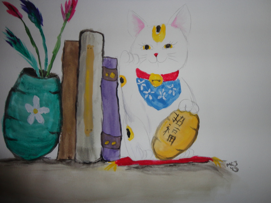 Sitting on a bookshelf is a small Nynako in a bookstore, it stares out at the customers coming and going. She smiles with her paw raised in hopes to bring luck to all those who come and go within the store.