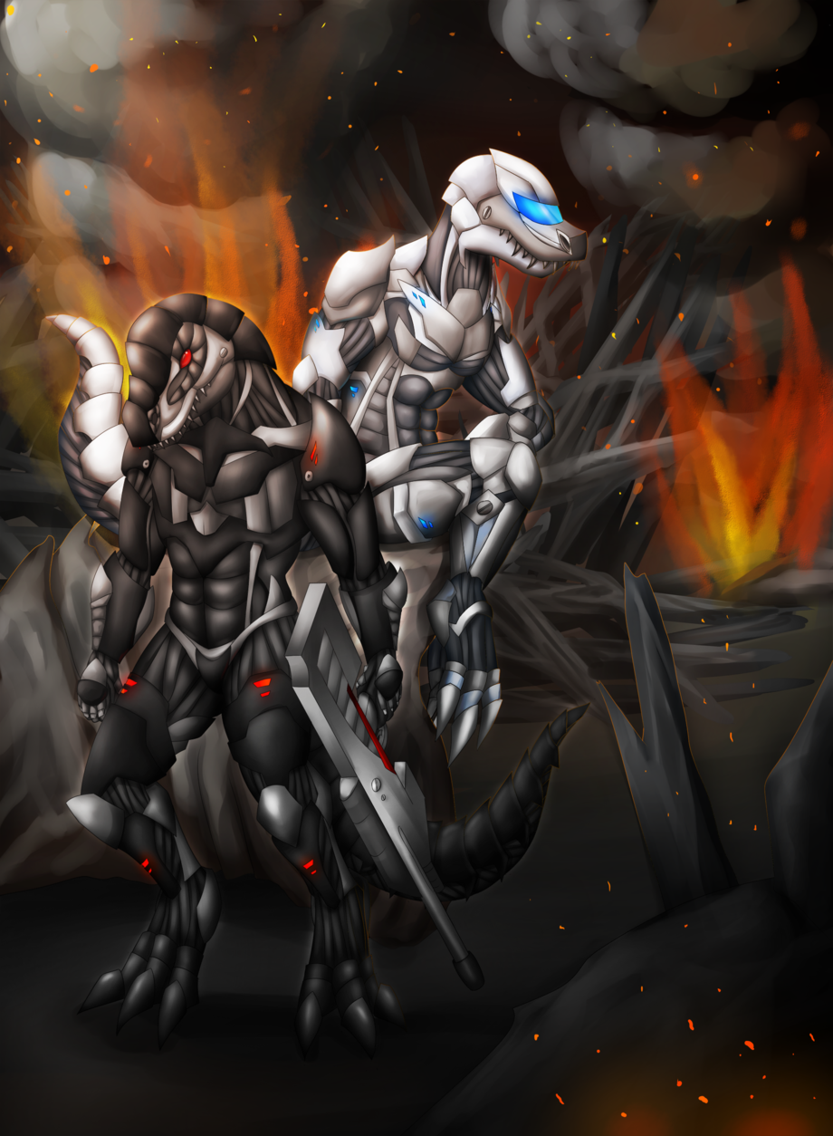 On a distant primitive world, one of the few in the galaxy where Dinosaurs were the ruling species, one tribe of Tyrannosaurus Rexes had a very intimidating reputation. The reason for that was these two, twin Rexes born into the tribe who became the strongest in the world, devoted to protecting their people and their territory. The female was born white and the male born black, something the mystics believed to be a mark of destiny. For years they hunted and fought, driving away all who would invaded their territory yet allowed those worthy of trade to enter. Until one fateful day where a rival tribe attacked, using weapons that had come from the stars and destroyed nearly everything they had. Both warriors were near death, the male more so than the female, but the owners of said weapons came to get back their property and found two new test subjects instead.