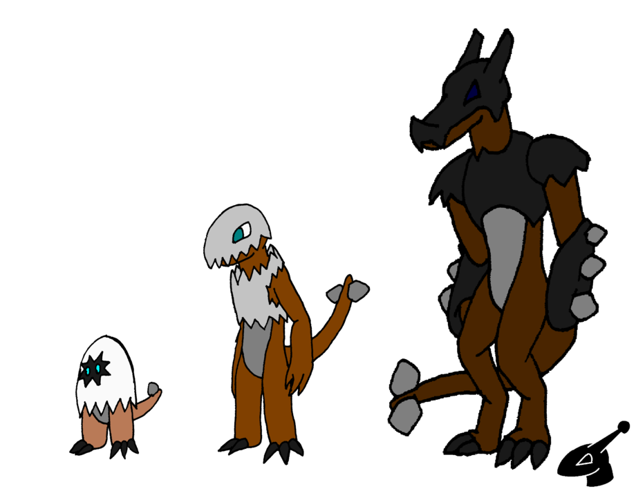 these designs may be fine tuned in the future, but for now I'm pleased with them. to go over what the thought process for this was most obviously an egg. The stage 1 never fully left its egg shell after it hatched, using it to protect itself in battle. stage two breaks a little more out of its shell and uses the top as a helmet. at this point the shell is beginning to meld with the creature. stage 3 the egg shell is now fully fused to the creature and strengthens as it does