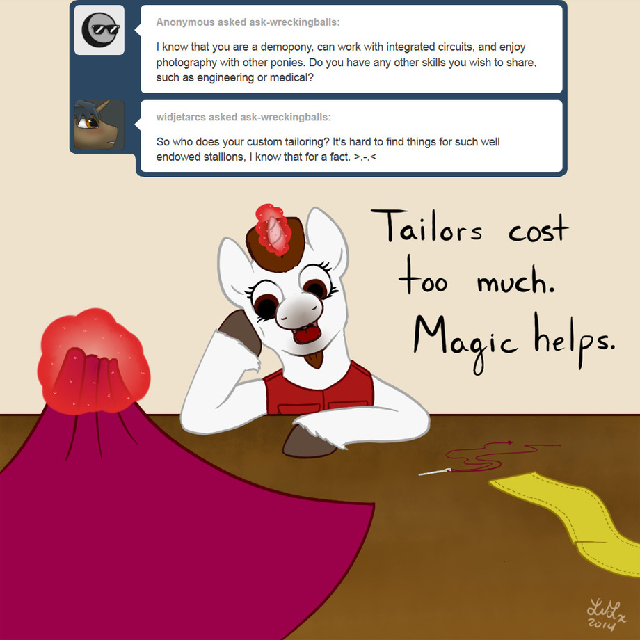 Q: So who does your custom tailoring? It's hard to find things for such well endowed stallions, I know that for a fact. >.-.<