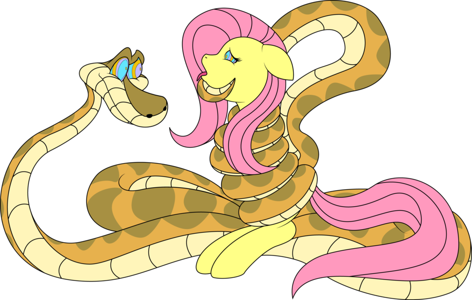 Kaa the snake from the devil with the Mouse hat's The Jungle Book and Fluttershy from a cartoon show for little girls but watched by grown men, caught him trying to eat her furry friends so tried talking to him then when he didn't listen tired to use THE STARE on him sadly it doesn't look like it works on "strong minds" so now she's screwed... or not... maybe Man Cub will save her or Angel Bunny when he get's off his furry little ass to do something about it